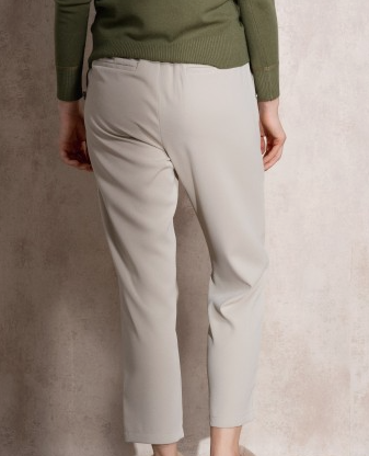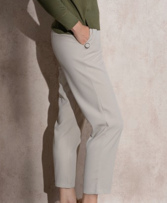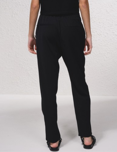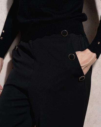 Pantalón de corte recto, cinturilla con elástico en la espalda, dos bolsillos laterales con botones decorativos, dos bolsillos en la parte trasera y goma en la cintura por la parte trasera.