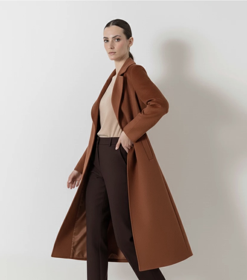 Abrigo largo cruzado con cinturón. Disponible en color caramelo y negro.